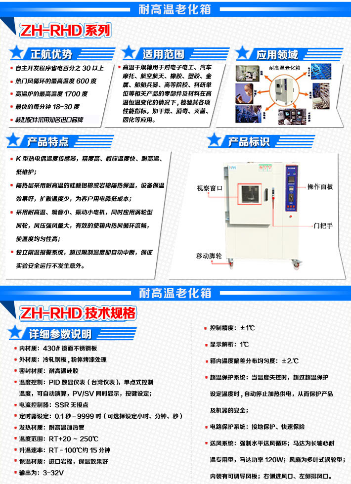 用于對電子電工、汽車摩托、航空航天、橡膠、塑膠、金屬、船舶兵器、高等院校、科研單位等相關(guān)產(chǎn)品的零部件及材料在高溫恒溫變化的情況下,檢驗其各項性能指標。嚴格按GB/T2423.2-2008高溫老化試驗方法制造。
