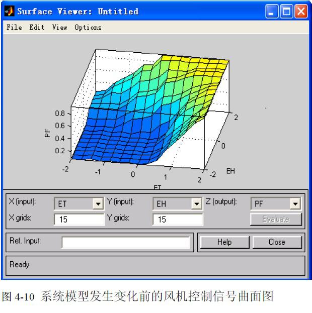 從仿真曲面圖中可以清楚的看到,當(dāng)系統(tǒng)模型發(fā)生變化時,風(fēng)機的控制策略也隨著發(fā)生變化,體現(xiàn)了系統(tǒng)的智能性和自適應(yīng)性。