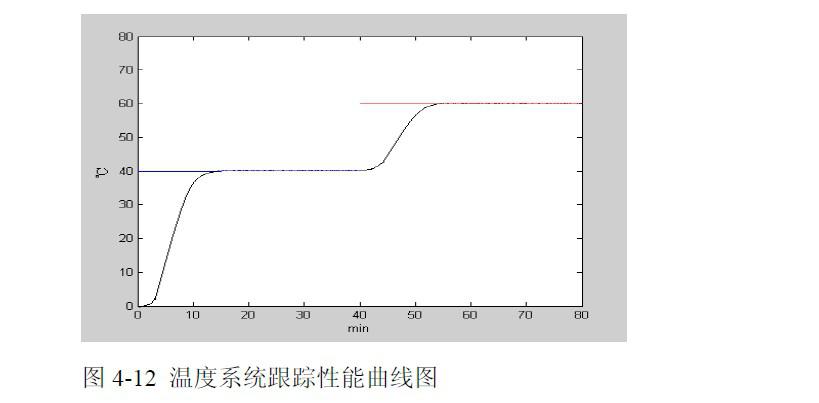 輸出變量經(jīng)過模糊判決后輸出的控制量在0—1 之間,表示各個執(zhí)行器的運行功率與運行功率的比值。采用對數(shù)型激活函數(shù)而沒有用模糊神經(jīng)網(wǎng)絡(luò)的輸出直接作為最終輸出的目的是為了讓執(zhí)行器能夠平滑過渡,減少磨損,延長使用壽命。環(huán)境試驗箱溫度系統(tǒng)仿真結(jié)果環(huán)境實驗箱在初始時刻設(shè)定跟蹤溫度為 40℃。在40 分鐘后設(shè)定為60℃。,誤差在2℃以外采用強制加熱或強制冷卻,在距離跟蹤目標(biāo)的誤差在2℃以內(nèi)啟動模糊控制策略,系統(tǒng)動態(tài)跟蹤性能如圖所示: